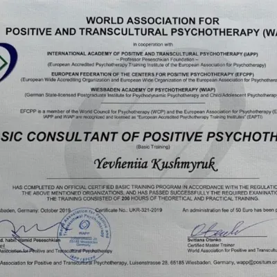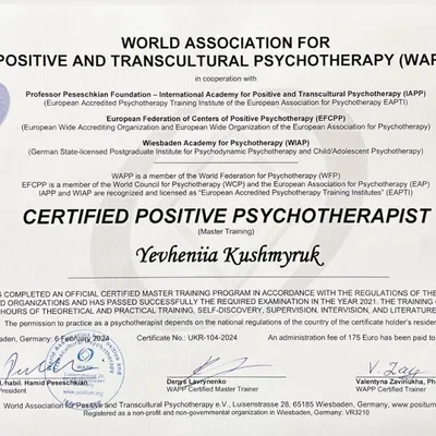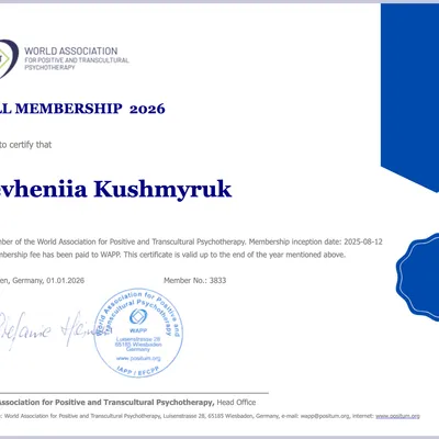 - членкиня WAPP (World Association for positive and transcultural psychotherapy)